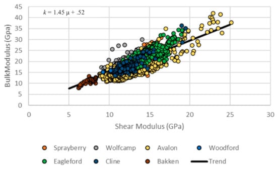 Using bulk modulus alone as a predictor of shear modulus and a single linear regression equation for all formations resulted in only a modest correlation (0.78) and relatively large error between measurements and predictions of nearly 3 GPa. The error can be improved using formation specific equations or regressing against volumetric compositional variables; the two most important being fractional volume of organic matter and volume of clay in that order.
