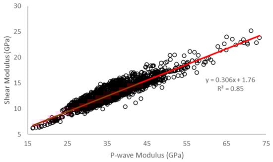 2 = 0.95) between predicted and observed moduli for both Equations (7) and (8) suggests that the use of P-wave modulus is robust without local calibration.