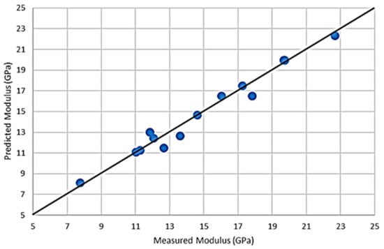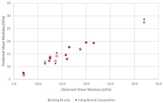 2) of 0.85; a good prediction with slope and intercept not far from unity and zero, but suggesting bias manifesting as an underestimation of large shear moduli and overestimation of small moduli. Adding compositional information with Equation (8) improves R