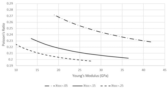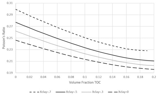 Figure 9) although the percent change is much smaller for Poisson’s ratio than for Young’s modulus. The magnitude of the increase in Poisson’s ratio with clay volume fraction is reduced at higher TOC where Poisson’s ratio becomes relatively insensitive to changing TOC as the curves flatten out.