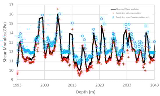 Figure 11 compares observed versus predicted shear moduli using P-wave modulus alone (Equation (7)) and using modulus and composition (Equation (8)). A perfect prediction would have a regression trendline between observation and prediction along the diagonal with a slope of 1 and an intercept of 0. Using P-wave modulus alone (