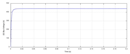 To verify the correctness of the FP-PMSG model, the simulation platform shown in Figure 2 was tested by running it for 0.2 s without faults. The average value of tidal speed v0 in Equation (1) was set to 3.6 m/s. The terminal currents of the FP-PMSG, the zoomed part of the currents between 0.08 s and 0.12 s, and the fast Fourier transformation (FFT) of the terminal current of phase a are shown in Figure 4. The DC bus voltage is shown in Figure 5.