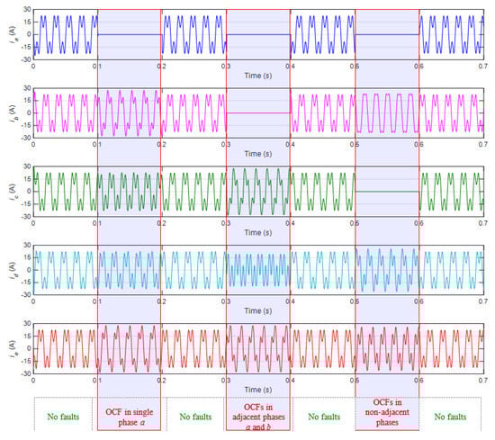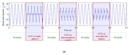 From Figure 15, it could be seen that the single-phase OCF in different FP-PMSG phases leads to disturbances in the direct-axis current components: the OCFs in phases a, c and d cause distinct variations to id1 with different patterns, while OCFs in phases b and e made id1 slightly change. However, all the variation patterns on id1 are different from each other, which could contribute to the faulty phase diagnosis.