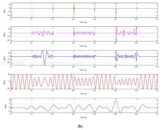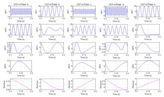 We collected the five-phase output currents of the FP-PMSG in each simulation and applied frame transformation to obtain the direct-axis components of the five simulations. The direct-axis currents in the five simulations are shown in Figure 15. We applied EMD to those id1 shown in Figure 15 to obtain IMFs and residues, which are shown in Figure 16.