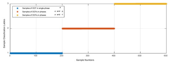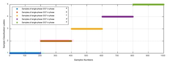 In total 1000 samples were extracted from the five single-phase OCF simulations, 200 in each from 0.1 to 0.2 s when there was an OCF. All samples were evenly distributed over time. Here, a 1000-by-15 feature matrix was obtained. Classification labels were assigned to the five single-phase OCFs as follows: