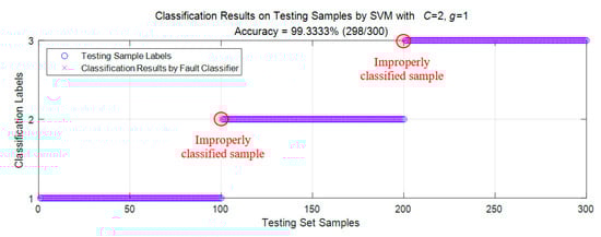 The fault classification results on the testing set by SVM with fixed parameters C and g are shown in Figure 18. The PSO iteration process and fault classification results on the testing set by CPSO-SVM are shown in Figure 19. The PSO parameter variation plots along with iterations, PSO iteration process, and fault classification results on the testing set by the proposed VPSO-SVM are shown in Figure 20. The simulation results’ statistical data of the three comparative methods are summarized in Table 5.