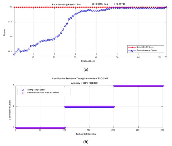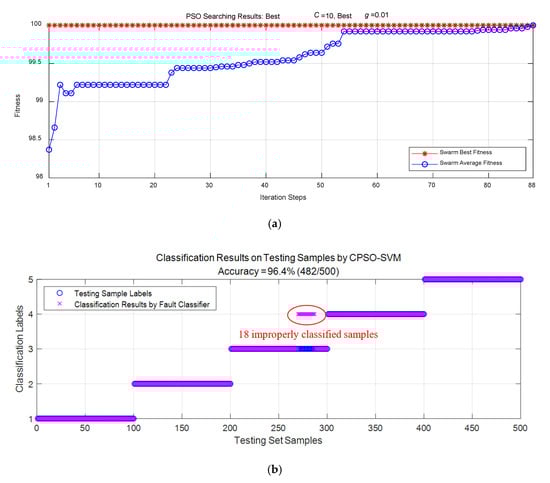 When the parameters of SVM were optimized by CPSO, it can be seen from Figure 19b and Table 5 that the SVM classification accuracy increased from 94.2% to 96.4%, and wrongly classified sample numbers decreased to from 29 to 18. However, searching optimal SVM parameters took time, the CPSO with constant c1, c2 and ω values iterated 88 generations to find the optimal values of C = 10 and g = 0.01, and as shown in Figure 19a, the total PSO iteration and SVM training time was 83.07 s.
