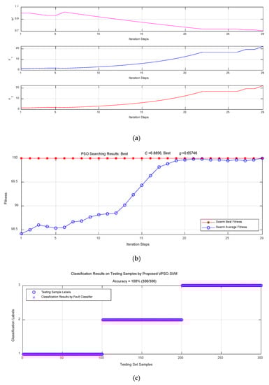 Fault classification results on testing set by VPSO-SVM with SVM parameters C = 10 and g = 0.01 optimized by CPSO. (a) Variation curves of c1, c2 and ω in PSO along with iterations. (b) Swarm average fitness evolving process along iterations (33 iteration steps to converge with variable c1, c2 and ω in PSO). (c) Fault classification results of VPSO-SVM with classification accuracy = 96.4%.