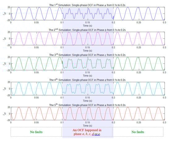 Ran the simulation platform shown in Figure 2 five times, the simulation durations were all 0.3 s. The single-phase OCF simulation procedures are as follows: