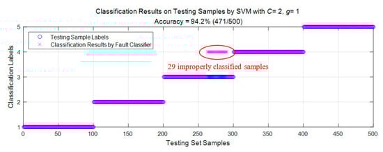 From Figure 18 and Table 5, it could be seen that if only SVM (with manually assigned parameters C = 2 and g = 1) was adopted for fault classification, the training time of SVM is only 0.004 s. But the assigned SVM parameters were not optimized, this made the classification accuracy 94.2%, and 29 samples among 500 were improperly classified.