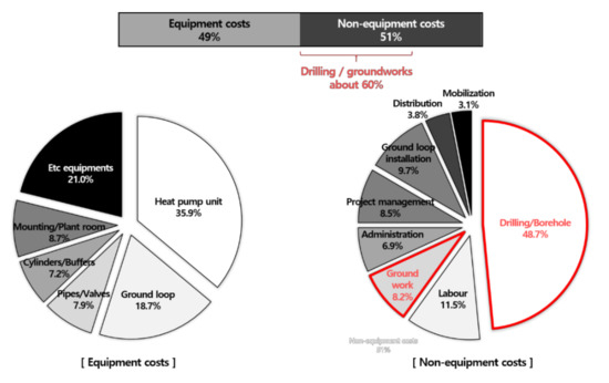 The performance of ground source heat pump (GSHP) systems is more stable than that of other heat source systems because the former use heat from the ground, which maintains a constant temperature throughout the year. In particular, although GSHP systems exhibit higher efficiency in energy use compared to conventional air source heat pump (ASHP) systems, their high investment cost, which includes the drilling cost and the difficulty in securing sites for system introduction, makes their introduction into small buildings difficult. For a typical closed-loop GSHP system, earthwork and boring account for approximately 40% of the total construction cost (Figure 1). Therefore, for the introduction of GSHP systems into small buildings, ground heat exchangers (GHXs) that can efficiently use the installation area and reduce the initial investment cost are required.