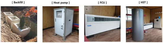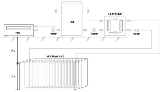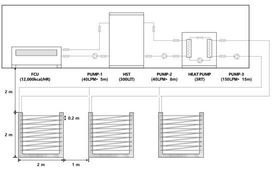 The modular GHX prototype was installed 2 m below the ground surface after the concrete curing process. The system consisted of three GHXs, a fan coil unit (FCU), a heat pump, a heat storage tank (HST), and three circulating pumps (Figure 10 and Table 7). The experiment was carried out for 8 h with a heat source and load temperature of 4 °C and 40 °C, respectively.