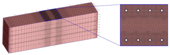 To develop a performance prediction equation for a modular GHX, a numerical analysis simulation model was constructed using the finite element subsurface FLOW system (FEFLOW), which enables the finite element analysis of groundwater flow, mass transfer, and heat transfer (Figure 3). The study by Kim et al. [18] was referenced for the construction of the numerical analysis model, and HDPE with a pipe diameter of 40 mm was grouted with concrete and installed 2 m below the ground surface. In addition, a one non-dimensional modular GHX unit was simulated under the assumption that adjacent heat exchangers were infinitely iterated. The numerical models of the GHXs and the ground in FEFLOW were validated in a previous study [19]. Since the number of cells per side was 8 or more, the mesh density was sufficient. In the numerical analysis, the flow rate was controlled at 14.98 L/min and the ground inlet temperature was limited to 5 °C to prevent the freezing of the heat exchanger under the heating operation conditions (Table 1). Table 2 shows the input properties of the components of the simulation model. Granite ground and weather data from Seoul, South Korea were used.