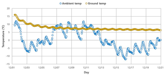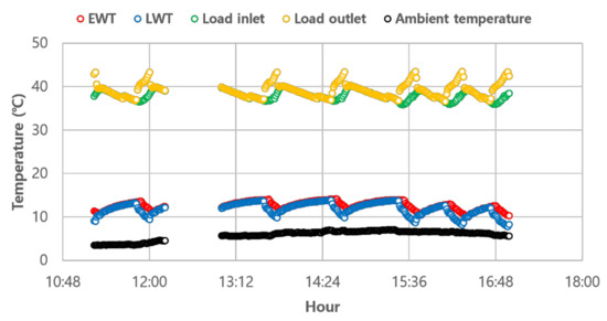During the operation, the average ambient temperature was 5.88 °C, and the EWT and LWT were 12.64 °C and 11.86 °C, respectively (Figure 11). Because the heat source temperature was always higher than the set-point (4 °C), the results showed that the system on/off depended on the load temperature. In addition, the heat exchange rate of the modular GHXs was 22.46 W/m during the experiment. This indicates that the modular GHXs received enough heat from the ground, although they were installed 2 m below the ground surface.