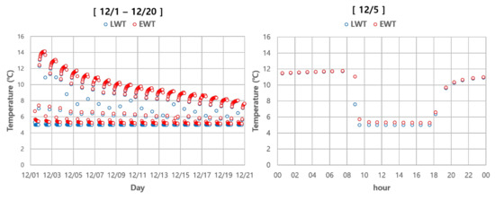 The numerical results for the average ambient and ground temperature were 0.42 °C and 8.00 °C during the period, respectively. This indicates that the ground source was a better heat source than the air source at the depth of 2–4 m. The results of the numerical analysis of the modular GHX revealed that the ambient temperature does not have significant influence on the ground temperature (Figure 4). The operation of the modular GHX was found to a have a relatively greater effect on ground temperature. LWT and EWT were found to decrease when subjected to operation conditions and increase with the increase of ground temperature during the non-operation period. From the daily data (12/5), it was found that LWT and EWT decreased during the operation period and increased during the non-operation period (Figure 5). Overall, EWT, LWT, and ground temperature continuously decreased as the operation continued and converged to certain levels after a week. The average EWT and LWT were calculated to be 8.11 °C and 7.86 °C during the operation period. The circulating water temperature was found to be strongly correlated with the ground temperature. Results of the numerical analysis showed that the EWT was correlated with the ground temperature and LWT. In a GSHP system, EWT is an important element that affects the performance of the heat pump and GHX, and the performance prediction equation can be used to calculate EWT using the ground temperature and LWT. In addition, the average heat exchange rate (HER) was found to be 20.07 per unit length during the operation period.