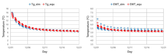 The ground temperature and EWT prediction models were used to calculate temperature levels during the heating period (1–10 December). Figure 8 shows the ground temperature and EWT results derived from the numerical model and prediction model. From the beginning of the operation of the modular GHX, both the ground temperature and EWT showed a tendency to decrease, and the decrease in temperature slowly decreased over time. The prediction models exhibited patterns that were similar to those of the numerical data. The equation data and simulation data, however, exhibited differences of 0.35 and 0.19 °C for the ground temperature and EWT during the analysis period (Table 4).