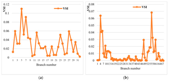 Voltage stability index (VSI) for: (a) 33-bus test system; (b) 69-bus test system.