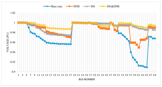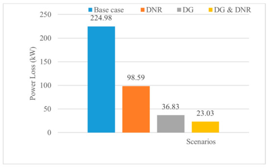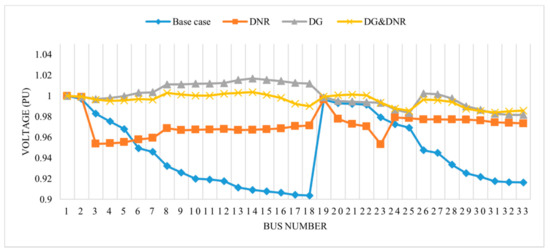 In this paper, four different scenarios are taken into account. These scenarios are: base case, only DG scenario, only DNR scenario, and simultaneous DG and DNR. The power loss reduction and voltage profile improvements in each scenario are depicted in Figure 3 and Figure 4, respectively. Simultaneous DG installation and DNR provides the minimum power loss, that is loss reduction of 82.13%, compared with the base case power loss of 211 kW. Furthermore, a significant improvement of voltage profile and DG penetration is achieved relative to other scenarios. When we consider only DG placement and increase the size of the DG for a better penetration level, the voltage profile near the DG location point is higher (more than 1 PU), as shown in Figure 4. This voltage increase is one of the limitations of the scenario of only DG placement. However, when the proposed method is used, the voltage profile is improved and smoothed (near to 1 PU), the power loss reduction is improved (Figure 3), and the DG penetration level is increased from 3323.86 to 3519.38 kVA. In Table 2, the percentage power loss reduction, DG penetration level increment, the tie switches opened, voltage magnitude improvement, and other details of the proposed system are presented. The simulation results are compared with references [44,45,46].