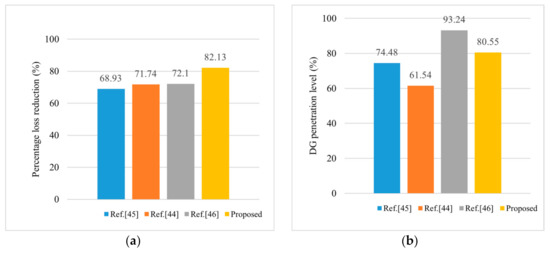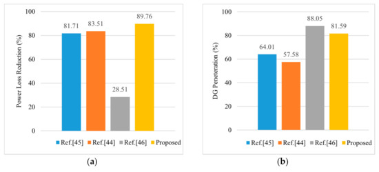 Comparison with references for the 69- bus test system: (a) percentage power loss reduction; (b) DG penetration increment.