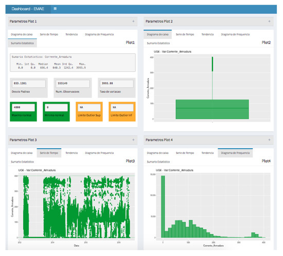 As in Section 5.1, component “Stator Armature” will be used here, once more, to demonstrate the tool. An analysis of one of its critical variables, the “Armor Current”, will be shown. An exploratory analysis of this variable is represented in the four blocks of Figure 5, in which all possibilities of statistical metrics and graphic analyses can be visualized.