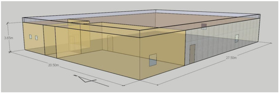 Figure 1 displays a schematic building model for this simulation research. This model utilizes an Energy+ template of the ASHRAE Standard 90.1.2016 OfficeSmall, which includes the information on location, orientation, construction set, material, thermal zone, and internal load. Each wall consists of two layers of 120 mm concrete and 30 mm insulation, and each window consists of two layers (double pane) of 6 mm clear glass. Assuming that the flow rate of air is linearly proportional as in known through several physical experiments, the opening ratio of the damper is directly utilized as the amount of supply air [27]. The conduction of envelopes and fenestrations is one of the major factors for the calculation of the heat loss, but the latent heat from people, lighting, equipment, and machine is not included for the heat gain. In order to save resources for this simulation, air pressure variations by the air flow are neglected. In addition, the air speed in convection and leakage in duct systems are not considered.