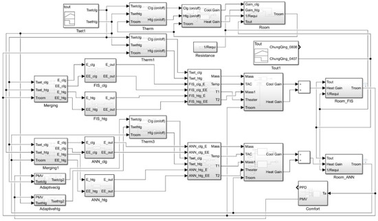 Figure 3 describes a simulation block diagram. Overall, the simulation model consists of six different modules: Thermostat (Therm in Figure 1); Thermal Energy Supply Model; Control (FIS and ANN in Figure 1); Room; Comfort; Adaptive. In order to effectively control Trm as Tset, the thermal energy supply module calculates the amounts of air mass and its temperature to send signals to the room. Based on the results in the room module, the comfort module calculates the PMV levels. From the PMV levels, the adaptive module determines whether Tset needs to be adjusted or not. Regarding this determination, the FIS and ANN modules calculate and send optimized signals to the thermal energy supply module. Then, each phase is repeated in this order at every one-minute time interval for 24 h. Regarding the simulation performance and Equation (5), this model utilizes the concept of a derived function rather than the differentials to measure temperature changes over time. For the development of this model, the ASHRAE standard templates in Energy+ and Open Studio were used. Furthermore, for the simulation per minute, the MATLAB was used to build six modules and to exchange weather data obtained from the IWEC into outdoor temperature signals.