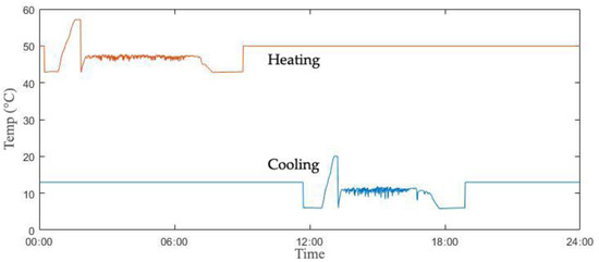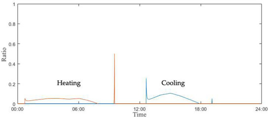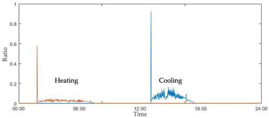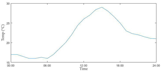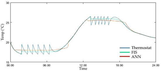 Figure 4 displays the changes in Tout of 28 April, Shanghai in China, and this climate information was retrieved from the International Weather for Energy Calculations. As indicated, uniquely, the daily temperature drops to 16.0 °C and then rises to 29.0 °C, resulting in a daily temperature difference of 13.0 °C. Figure 5 describes the comparison of Trm by the thermostat, the FIS, and the ANN controls. The range of temperature changes by the thermostat is wide within about 2 °C but quite regular, so the thermostat control rule may be effective in reducing its energy use, but there is a chance of disadvantages of consistent maintenance for users’ thermal comfort.