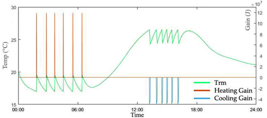 In Figure 6, Figure 7 and Figure 8, it can be clearly confirmed that the distinct characteristics of heating and cooling gains changed to maintain Tset by the three different controllers. In the case of the thermostat, as in Trm graph pattern, there are constant and regular changes of heating gain, from 0 to 12 on the gain axis from 02:00 to 06:30 and 13:00 to 16:00 on the time axis. In the case of the FIS control, it displays a very complex aspect, which in turn is reversed with Trm graph in Figure 5. Although there is a continuous energy supply, the overall low level of heating and cooling energy is identified, and the maximum energy requirements are significantly suppressed in the area where the control of the system begins.