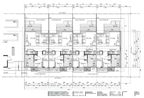 The present study is part of a proposed social housing project in Christchurch (New Zealand), which intends to provide simple housing for residents who would otherwise have to live on the streets. The annual weather data for the Christchurch region is presented in Figure A1 (Appendix A). The average monthly wind speed ranges between 2 and 4 m/s with an annual wind speed of 3 m/s. June to August are the coldest months of the year, while December to February are the hottest months. As shown in Figure A1, the average daytime high outdoor temperature in the summer is within 21–23 °C, while that in the winter is between 11 and 13 °C. The simulations considered multiple internal heat gains from occupants, equipment, etc. and were performed using real weather data. The simulation study provided a comprehensive first estimation of the benefits achievable through the application of PCMs for two specific building designs, before employing PCMs in these buildings. For the setting up of the simulation models, architectural plans and specifications regarding the construction materials were received from the executing contractor, and they are presented in Figure 1 and Figure 2, respectively, for the double-unit and studio-unit houses.