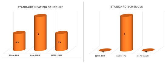 The schedule type for each room space (zone) and other room-based schedules are listed in Table 1, and their various schedules are defined in Figure 3. Table 1 shows the occupancy, shading control, mechanical and natural ventilation, and heating schedule type for the two buildings under study. Consider row 1 of Table 1 (Bedroom A), where the schedules are given in percentages; from 12:00 a.m. to 7:00 a.m., the bedroom occupancy is full, while only 50% of the occupants are present in the bedroom from 7:00 a.m. to 8:00 a.m. A further reduction to 25% occupancy is observed between 8:00 a.m. and 9:00 a.m. From 9:00 a.m. to 10:00 p.m., the bedroom is left unoccupied; then, by 11:00 p.m., 25% of the occupants are back, and, between 11:00 p.m. and 12:00 a.m., the bedroom is fully occupied. A similar pattern was used to describe the remaining schedules presented in this work.