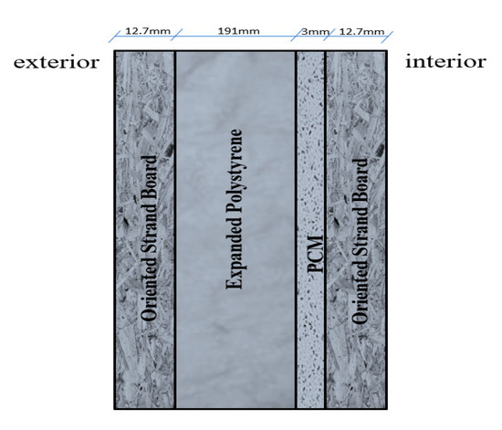 For the simulations performed in this work, the Energy Plus simulation engine Version 8.1.0.008 was used. A one-dimensional conduction finite-difference solution algorithm is used in this version. This algorithm was validated in [32] against multiple test suites (analytical verification, comparative testing, and empirical validation); hence, it is suitable for the simulation of real thermal behaviour of PCMs in buildings. In the simulations, the PCMs are consistently positioned to the interior surface of the insulation layer for all structure components. Thus, the wall assembly is made of four different layers, as shown in Table 2 and Figure 4, with PCMs next to the interior wall layer, while the partition walls have a PCM layer on either side of the oriented strand boards (Table 3). The operation of the windows and shading device are presented in Table 4 and Table 5. Details of the roof, floor, and external door construction assembly are also illustrated in Table A1, Table A2 and Table A3 (Appendix A).