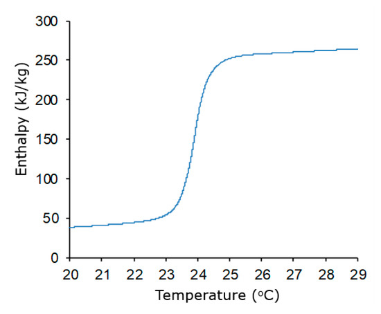 The enthalpy–temperature (H–T) curve is a major characteristic feature of PCMs that helps determine the heat storage capacity. Figure 5 illustrates the H–T curve of PT24 at various temperature conditions with the major phase change occurring between 23 and 24 °C.