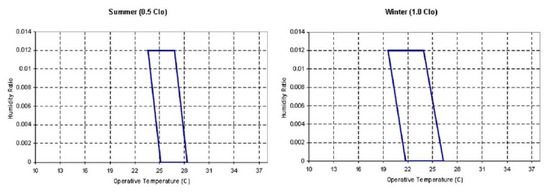 The discomfort model based on ASHRAE Standard 55-2004 and the Fanger predicted mean vote (Fanger PMV), calculated according to ISO 7730, were used from the generated simulation data to evaluate the comfort level of occupants. As such, the discomfort hour (DH) data are equivalent to the ASHRAE “unmet load hours” [33] and represents “the time when the zone humidity ratio and operative temperature are not in the ASHRAE 55-2004 summer or winter clothes region” [34]. The respective comfort areas for winter and summer clothes are illustrated in Figure 6. Furthermore, for the calculation of the discomfort hours, the occupation of the considered zone was needed so that DHs were not included for times when the room was completely unoccupied.