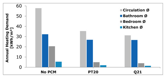 According to Figure 7, the heating demand for each zone of building B was different. With the use of sequence 2, the most significant influence of PCM was observed for the bedroom and kitchen areas, which had annual energy requirements of less than 10 for both PT20 and Q21 PCMs. There was only a minor PCM effect for the bathroom zones compared to the building without PCM.