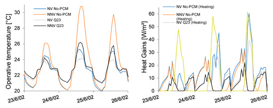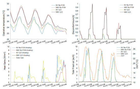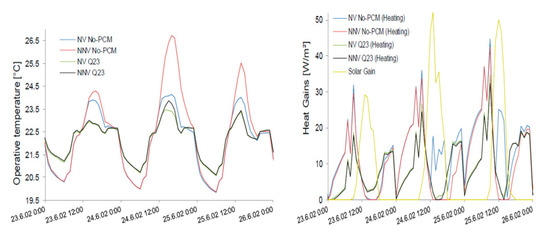 Nevertheless, the lack of thermal mass in the no-PCM models caused higher temperature fluctuations up to 31 °C. Overnight, the temperature was reduced in both no-PCM-models, but only the NV no-PCM model reached temperatures below the HSP of Seq. 4. Hence, the hot water radiators must heat the building in the morning hours before the building naturally heats up through high outside dry-bulb temperature (OUTs), solar gains, etc.
