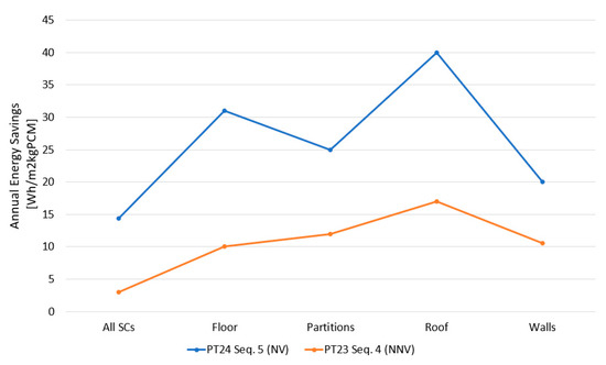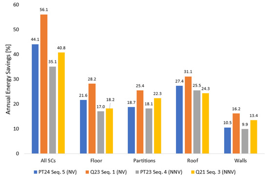 A fraction of the investigated models were altered to demonstrate the respective energy saving potential for each structure component (SC). Due to economic considerations, the layer thickness in each building component was chosen to be 3 mm (or two layers of 1.5 mm for the internal partitions). Some of the results for building B are illustrated in Figure 13.