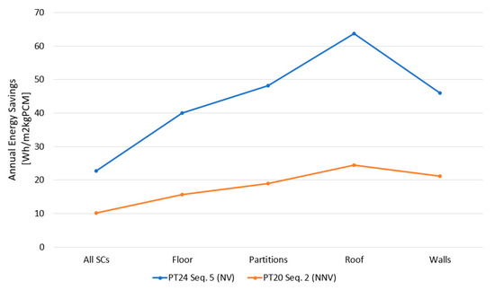 When only a small PCM mass should be applied, the determination of the most effective surface or structure component is necessary. According to the selected building material composition and the inclusion of PCMs in the roof as a complementary solution in our simulation, the roof provided the highest energy-saving potential for both buildings among all structure components (19–27% annual energy savings).