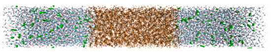 The initial configuration of the simulation box consists of three parts, including two CW regions and one oil region, as shown in Figure 1. Each CW region includes 4000 water molecules and 0, 34, and 68 CO2 molecules, which corresponds to a CW flow with a CO2 mass fraction (ωCO2) of 0.0%, 2.0%, and 4.0%, respectively. The oleic phase includes 400 decane molecules. Each region is set as an orthogonal box in which the dimensions are Lx × Ly × Lz, where Lx = Ly = 4 nm, and Lz is determined by the density of the solution, which is about 8 nm. Periodic boundaries were used in all of the dimensions. The box is large enough to completely observe the CO2 diffusion between the phases.