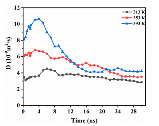 While considering the anisotropy of CO2 diffusion in the system, the one-dimensional diffusion of CO2 in the direction vertical to the interface (z axis) was studied. As shown in Figure 4, DCO2 had an increasing trend at the beginning. This implies that the accumulation behavior of the initial stage promotes the diffusion of CO2. With the continuous transfer of CO2 in the medium-term of diffusion, DCO2 shows a downward trend. During this period, a large amount of CO2 dissolves into decane, and the deepening of the diffusion gradually weakens the driving force. Finally, the CO2 reaches a dynamic equilibrium in the system and DCO2 is unchanged. The temperature increase causes an evident rise in the initial diffusivity of CO2 between the two phases. In addition, the higher the temperature, the earlier the curve falls, and the system reaches equilibrium sooner. At a temperature of 393 K, the diffusion curve drops rapidly, and the system reaches equilibrium at 16 ns. At 353 K, equilibrium is reached at 25 ns. At a temperature of 313 K, the DCO2 decreased slowly with time. Compared to 353 K, the equilibrium time at 393 K was reduced by 36%. In summary, we believe that CO2 is affected by the difference in the interaction between water–CO2 and decane–CO2, and causes CO2 to continue diffusing into the oleic phase. Because the movement of CO2 during the initial stage of diffusion enhances the interaction between CO2 and decane, the initial diffusion rate increases. Then, with the continuous diffusion of CO2, the driving force caused by the interaction difference is weakened, and the diffusivity gradually decreases until the system reaches equilibrium.