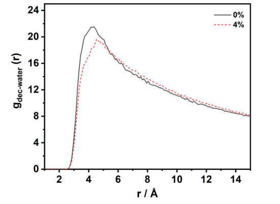 Figure 6 describes the radial distribution function (RDF) of the water–decane molecules at the interface at 353 K and 20 MPa. It can be observed that the two curves have only one peak, and no second peak appears. This implies that, at the interface, the water–decane molecules showed a loose and disordered structure. When the CO2 concentration was 0%, the first peak of the RDF was located at 4.35 Å with an amplitude of 21.5. When the CO2 concentration was 4%, the first peak of the RDF was located at 4.75 Å with an amplitude of 19.4. The presence of CO2 at the interface made the amplitude lower and the position of the peak increased. The RDF describes the probability that a decane molecule is present at a distance r from a water molecule. The possibility decreases with an increasing CO2 concentration. This shows that the accumulation behavior increases the average relative distance between the water and decane molecules. The solution structure at the interface was looser, which had an important effect on the reduction of the interfacial tension.