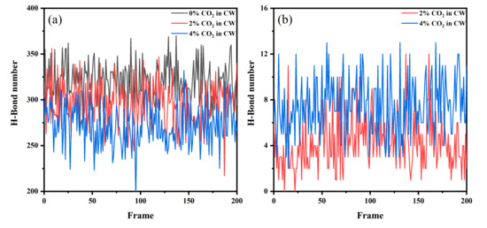 The hydrogen bonds (H–bond) between the water molecules have an important influence on the structural strength of the solution. In liquid water, a dynamic H bond network can be formed, which also forms clusters of water molecules. This makes the connection between the water molecules closer, which affects the interfacial tension. Therefore, we explored the H bond number at the CW–decane interface. Given that the lifetime of H bonds is generally between 1–20 ps, 200 configurations were counted after system equilibrium and the time interval between each configuration was 10 ps. As shown in Figure 7, more H bonds were generated between water and CO2 as the CO2 concentration in the CW increased. Meanwhile, the number of H bonds between water molecules gradually decreased since the H bonds reached saturation. When the H bonds between the oxygen molecules in CO2 and the hydrogen in water form, due to the mutual repulsion between the negative ions, the oxygen atom is more difficult to access for other water molecules. The above shows that the network structure between the water molecules at the interface is weakened by the influence of the CO2 molecules, which reduces the interaction between the water molecules and promotes the mutual penetration of molecules at the interface. H bonds enhance the interaction and make the structure between water and CO2 more stable, which is conducive to the accumulation behavior of CO2.