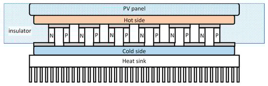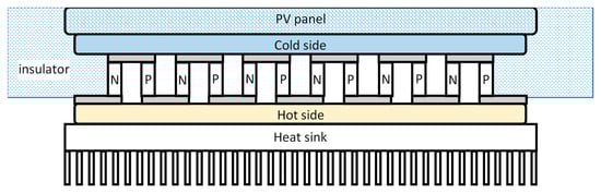 The second structure is the PV-TEG (Figure 2). The TEG is used for cooling the PV by absorbing the heat from the PV, converting a part to electricity (electrical cogeneration) and transferring the rest of the heat to a heat sink. The advantage of this structure is the electrical cogeneration of the TEG, but the cooling efficiency is less than in the PV-TEC configuration. The heat sink could be passive (aluminum heat sink) or active (water [18,19] or nanofluids [20]).