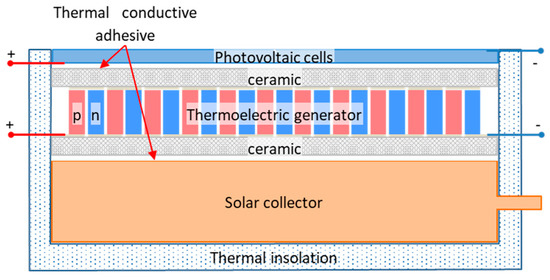 The third one is presented in Figure 3, being formed from three active components also placed in a sandwich structure (PV-TEG-T). In this structure, the heat sink is replaced with a thermal collector in order to add thermal energy generation besides the electrical generation of the entire HS.