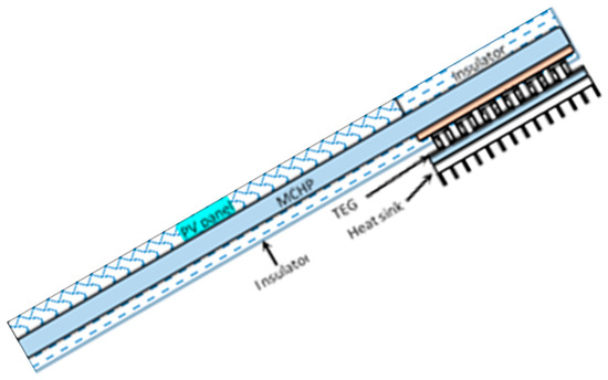 There are structures proposed in the literature that are indirectly coupled, supposed to have a distributed structure or mixed. Therefore, the fourth structure is PV-TEG distributed, shown in Figure 4. In fact, this structure is a mixed one that involves heat pipes or a micro-channel heat pipe (MCHP) system composed of two parts: an evaporator part that is directly coupled with the PV, extracting waste heat from the PV, and a condenser part that is directly coupled with the TEG, conducting the heat to the hot side of the TEG [21,22,23].
