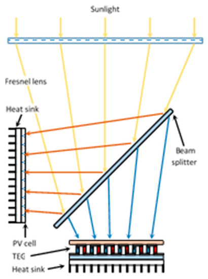 The indirectly coupled HSs were studied in [40] by introducing a beam splitter (BS) (see Figure 5). The study was oriented to the design and optimization of a beam splitter in order to maximize the energy generation by the HS considering amorphous and multi-crystalline Si cells. The proposed model was numerically solved based on the Nelder–Mead simplex algorithm using the MATLAB software. Skjølstrup and Søndergaard showed that the efficiency of an HS with an optimized BS can be increased by 13.2 and 21.4% for the case of mSi and aSi, respectively, compared with a single PV cell. Yang et al. [41] propose an updated model for a BS used in PV-TEG HS. A detailed analysis was focused on the influence of the area ratio of the thermal collector of the TEG to the PV cell on the output and efficiency of the HS. The results show that the optimal area ratio is closely dependent on the light concentration. Yin et al. [42] propose a method for optimizing the BS for a PV-TEG HS from the optimal operating temperature and cutoff wavelength point of view. The results show that the optimal HS efficiency increases with the figure of merit of the used TEG, and the optimal cutoff wavelength decreases when increasing the ZT.