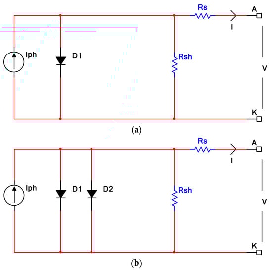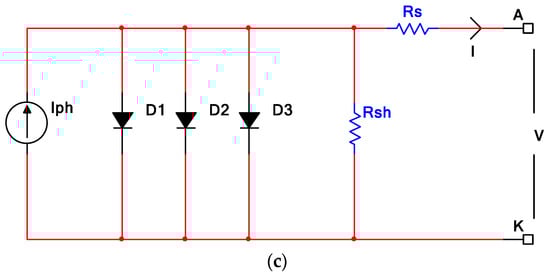 - Three-diode model:where I and V are the current and voltage generated by the PV, Iph is the photogenerated current, I0 is the reverse saturation current, q is the elementary electrical charge, Rs and Rsh are the series and shunt resistances, n is the ideality factor of the diode, k is the Boltzmann constant and T is the temperature. The 1, 2 and 3 indexes relate the diffusion, the generation–recombination and the thermionic mechanisms, respectively.