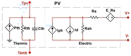 In Figure 7, the thermal model is added beside the one-diode electrical model. The model components are Pth, the current source that models the radiation absorbed and converted to heat, and the power dissipated on Rs and Rsh; Rth, the thermal resistance; Cth, the lumped heat capacitance of the PV; E_Rs, which is a voltage source that models the variation of the Rs depending on the temperature; Tpv, the PV temperature; and Id, the current source that models the current through the diode [24].