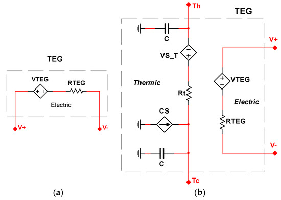 In Figure 8, the thermal model is included, consisting of VS_T, the voltage source that models the Peltier cooling and heating on the corresponding sides; CS, the current source that models the Joule effect through the TEG; Rt, the resistance that models the thermal resistance of the TEG; and C, the capacitors that model the lumped heat capacitance of the ceramic plates of the TEG [24,30].