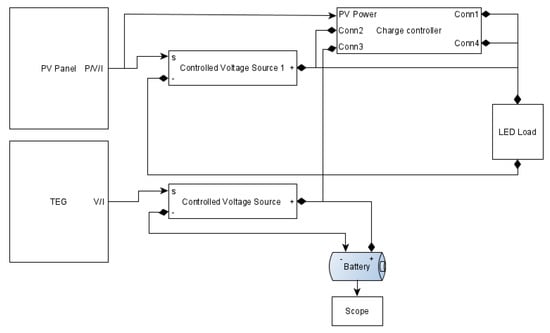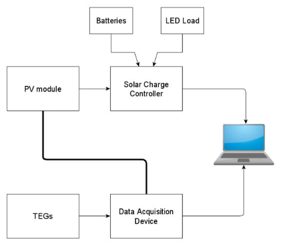 A directly coupled PV-TEG HS for natural light and based on the load requirement was designed by Shatar et al. [51] under a tropical climate. The block diagram of the proposed HS is shown in Figure 11. The HS consists of 4 × ADL100-12V PV panels (1200 × 540 × 30 mm), 12 × SP1848–27145 Bi2Te3 TEGs (40 × 40 × 3.4 mm), 3 × PGEL-100–12 Lead Acid batteries (12 V, 100 Ah) and a solar charger controller (30 A). The PV panels and the batteries were connected in parallel, and both, to the solar charger controller. The TEGs were connected in different configurations: all in series, two groups in parallel, each composed of six in series and three groups in parallel, and each composed of four in series. The solar charger controller was also used for the PV, battery and load parameters; ambient temperature measurements; and data logging (the power generated, state of charge and power absorbed, respectively). The VOC of the TEGs and the PV temperature were measured using a NI USB-6211 DAQ. K-type thermocouples were used as temperature sensors. An interesting result is described in the paper; namely, during the night, there was a temperature difference between the PV and the ambient temperature (the cold side of the TEG), which resulted in electrical generation during the entire night.