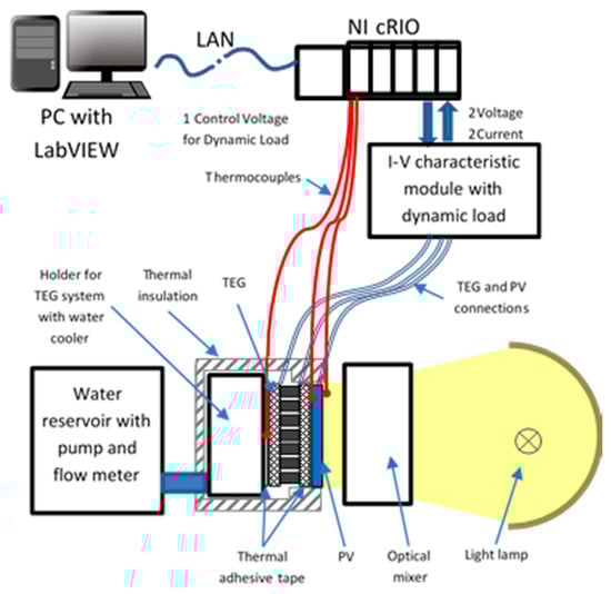 The behavior of the directly coupled PV-TEG HS at a low solar concentration was studied by Mahmoudinezhad et al. in [47] and [48]. The studies were accomplished based on a solar simulator with xenon arc lamps. The solar concentration ratio was up to 39 suns. The HSs used were composed of a triple-junction InGaP/InGaAs/Ge solar cell (with an active area of 10 × 10 mm) and a Bi2Te3 TEG (with an area of 8.7 × 8.7 mm) connected to a water-cooled copper heat sink. The measurement system was developed around the NI cRIO 9074 platform, with dedicated modules for voltage, current and temperature measurements and the NI LabVIEW programming language used as controlling and data analysis software. The I–V–P characteristics were used as a characterization method. The scheme of the used experimental setup is presented in Figure 10. The same system was used in [31], where more details are offered regarding the uncertainties of the measurements obtained with the developed system. In [47], the HS’s responses to different solar concentration levels were studied, experimentally but also numerically. For numerical simulation, the MATLAB software was used for solving the partial differential equation of the proposed HS model. The paper shows that the ratio between the maximum power generated by the TEG and that generated by the CPV increases once with the solar concentration. In [48], the transient response of the HS was investigated. A time-dependent pattern of the solar concentration level was applied to the HS, and its components’ responses were monitored. The investigation was accomplished both experimentally and numerically. For numerical analysis, the COMSOL Multiphysics Modeling Software was used. The results illustrate that the CPV had a rapid response to the light variation, which was altered in time due to the temperature variation, while the TEG response was more gradual, almost following the temperature variation. This behavior of the HS components indicates that the TEG increases the stability of the generated power of the PV.